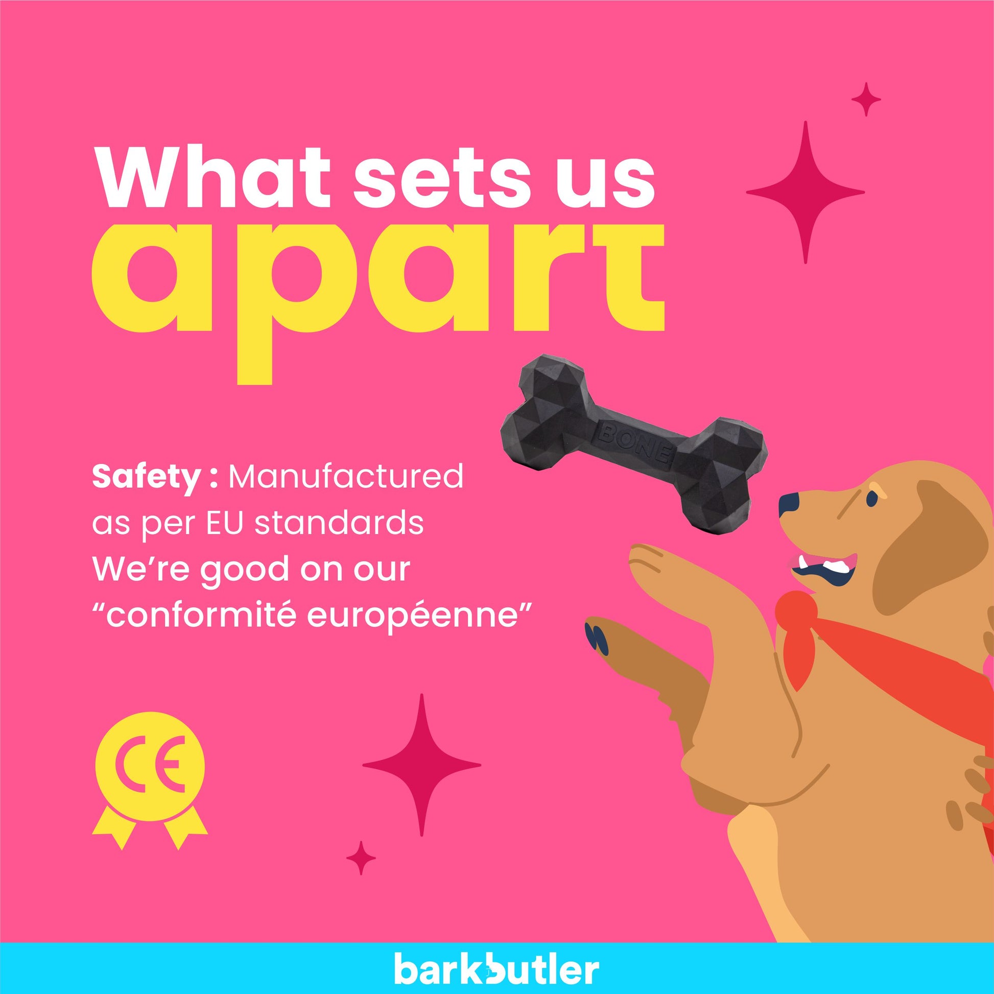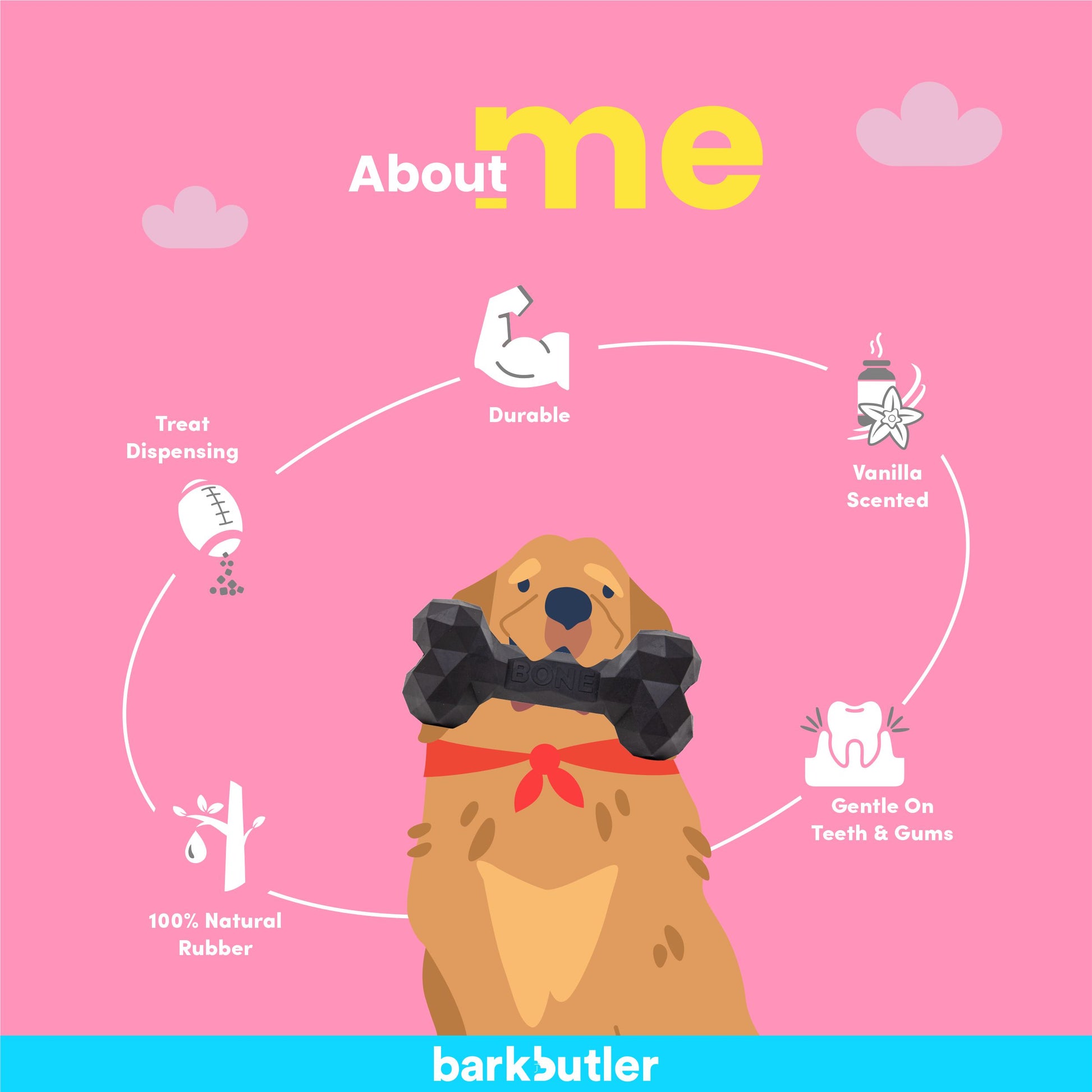 Barkbutler ChuThe Bone Black is a durable dog chew toy made from 100% natural rubber and is gentle and soft on the teeth and gums.